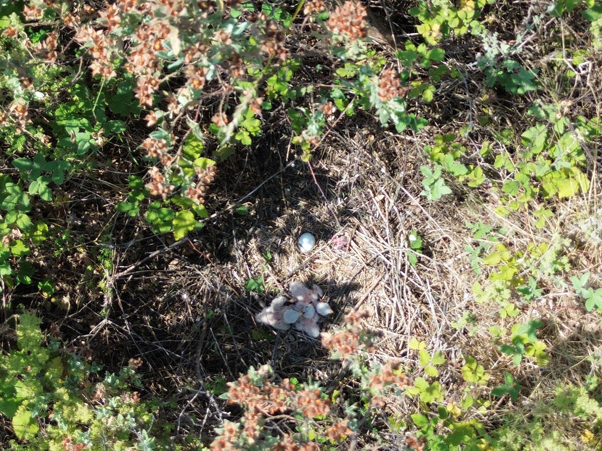 Imatge de dron del niu trobat aquest 2025 en una brolla d’estepes, on s’hi observen els polls de pocs dies d’edat i un ou no eclosionat. Val a dir que en aquest cas tots els joves aconseguiren agafar el vol. Tant la brolla d’estepes com el fonollar –amb dos nius– són dues comunitats vegetals noves per la nidificació del cendrós a l’Empordà d’ençà que en tenim registres.